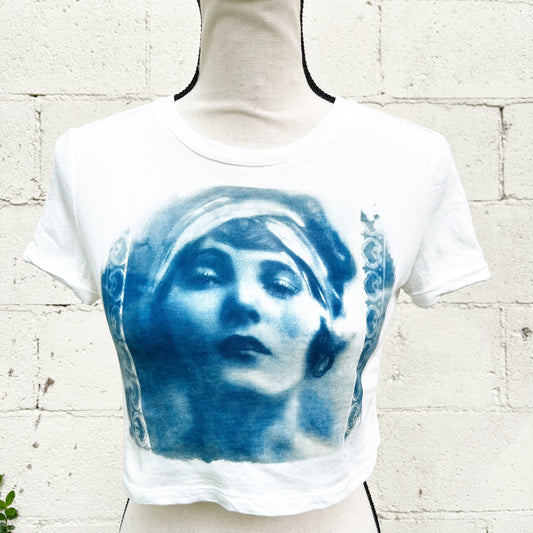 Cyanotype Sunprint Retro 1920's Flapper Blueprint Babydoll Crop Tee XS